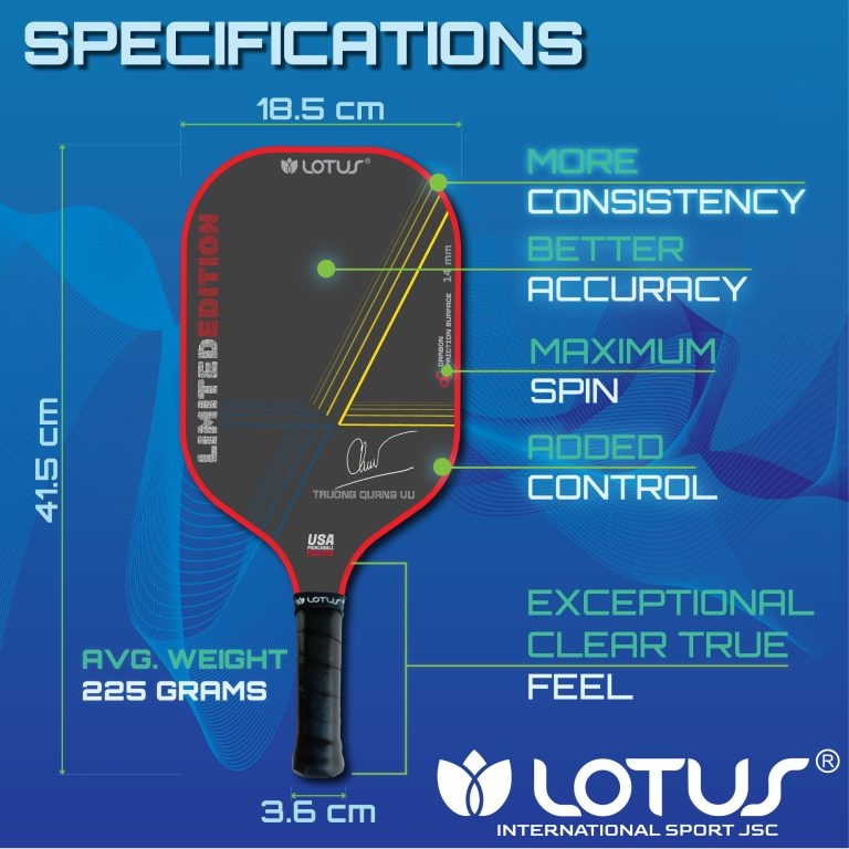 Vợt Pickleball Lotus Limited Edition – Phiên bản đặc biệt kết hợp cùng HLV Trương Quang Vũ không chỉ mang lại hiệu suất đỉnh cao mà còn giúp người chơi kiểm soát tốt hơn, tối ưu từng cú đánh trên sân.